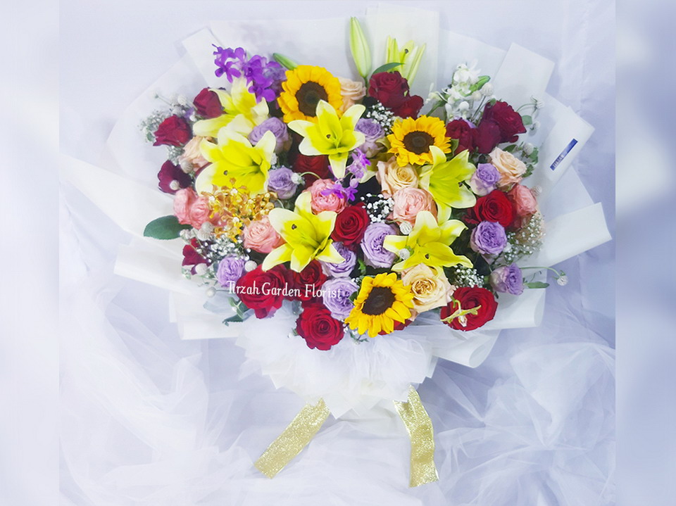 Variant | babybreath, lily, roses, sunflower, |